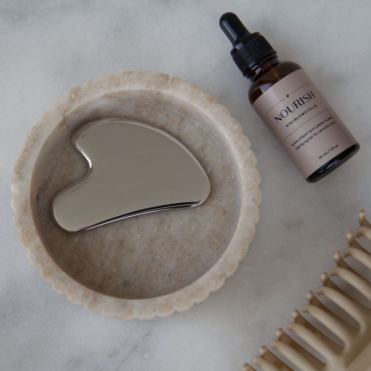 Denne bundelen kombinerer vår gua sha med næringsrik ringblomstolje - perfekt for å stimulere sirkulasjon, redusere spenninger og gi huden naturlig glød.